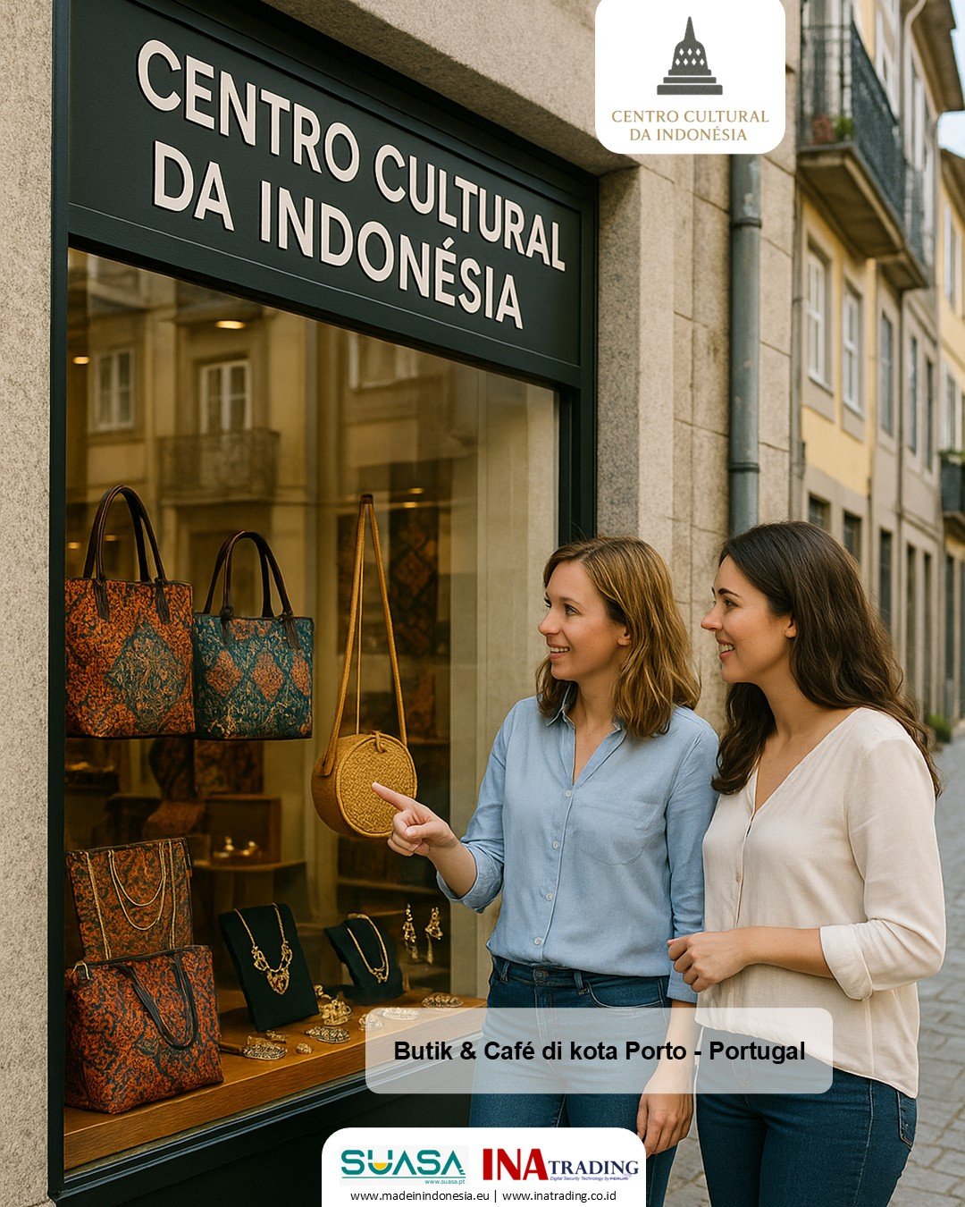 Kolaborasi antara SUASA Portugal dan INA Trading @Europe memberikan kesempatan bagi UKM, Koperasi, BUMDES & Industri untuk melakukan Program : KIRIM - SIMPAN - JUAL, sangat tepat bagi mereka yang hendak penetrasi Pasar di Portugal & Spanyol maupun bagi yang sudah memiliki pasar di Portugal dan Spanyol sehingga memudahkan pengiriman dari kota Porto ke seluruh kota di Portugal dan Spanyol.